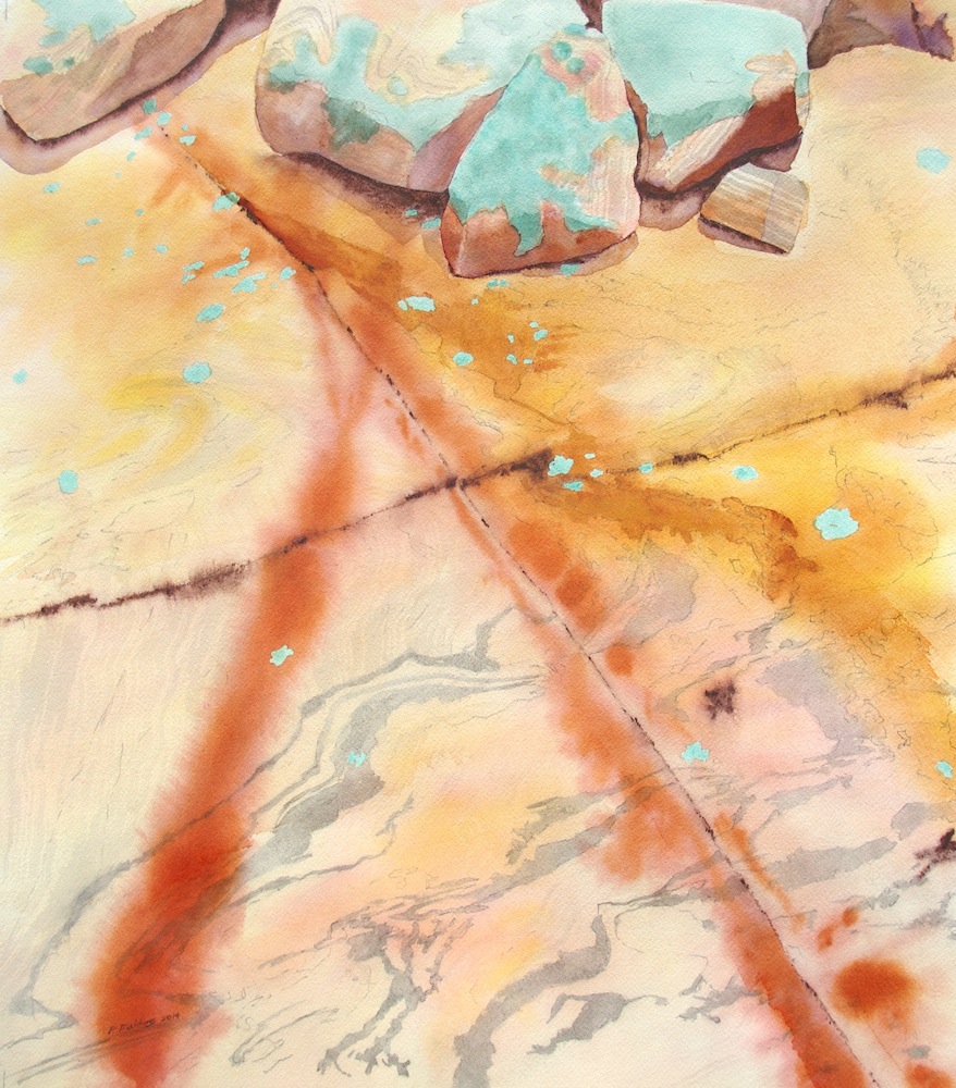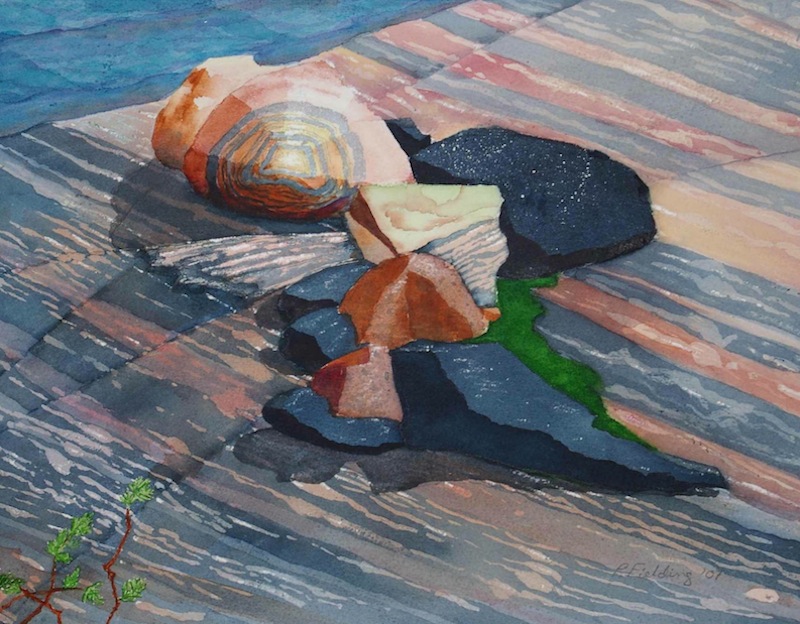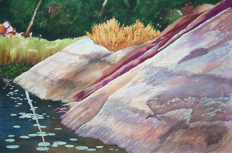 Camping at Six Mile Lake Provincial Park, I came across these exuberant little boys surfing with their kayak. Rather than painting water as it looks, I painted what it feels like plunging and splashing. Every child who has played with a dip net at Six Mile will recognize the Pumpkinseed fish that are so abundant there.